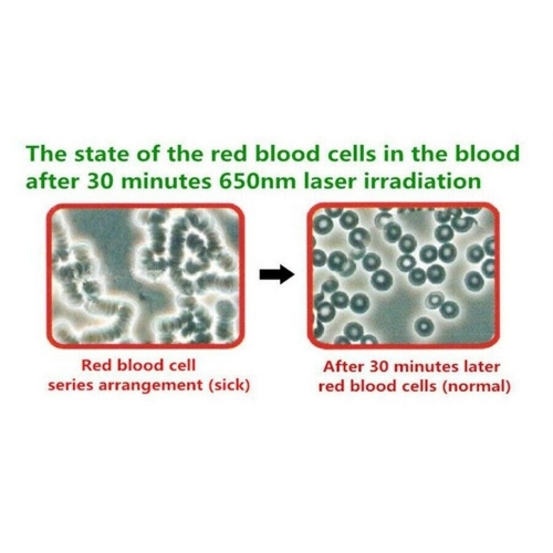 Rode laser versnelt het metabolisme: verlaagt de bloeddruk, verbetert de bloedstroom, verkleint de mogelijkheid dat cholesterol en andere bloedvetten zich ophopen op de vaatwanden en vergroot het aantal rode bloedcellen dat zuurstof kan vervoeren, zodat het de zuurstof kan leveren en voedingsstoffen naar elk orgaan.